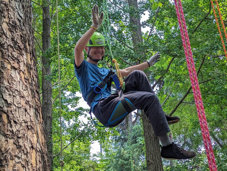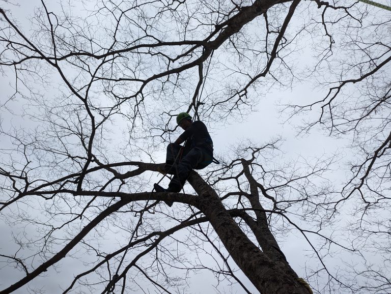 ツリークライミングとは、体とロープを固定させるサドル、手袋と大事なヘルメットを着用して、1本のロープだけで木を登ることです。